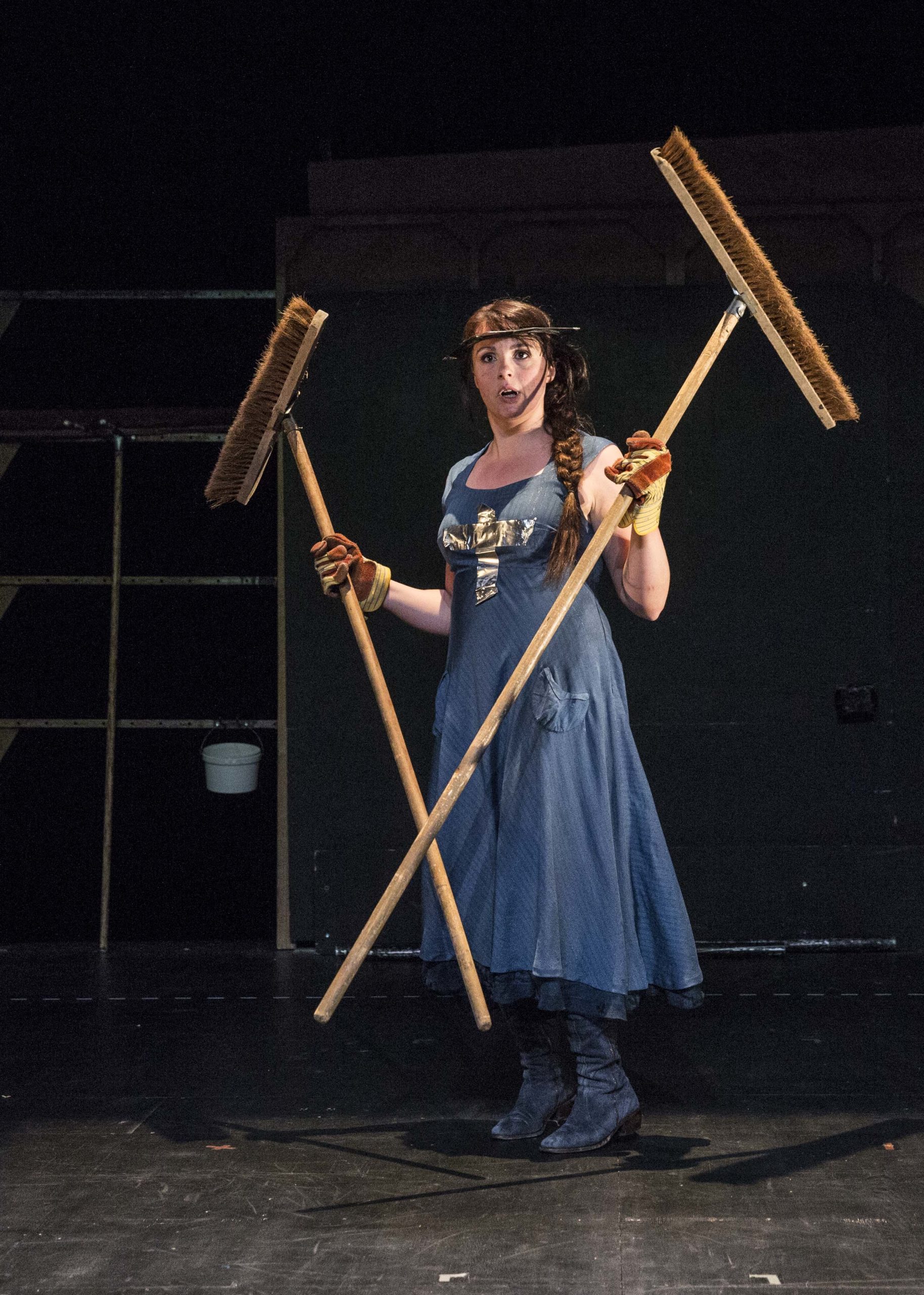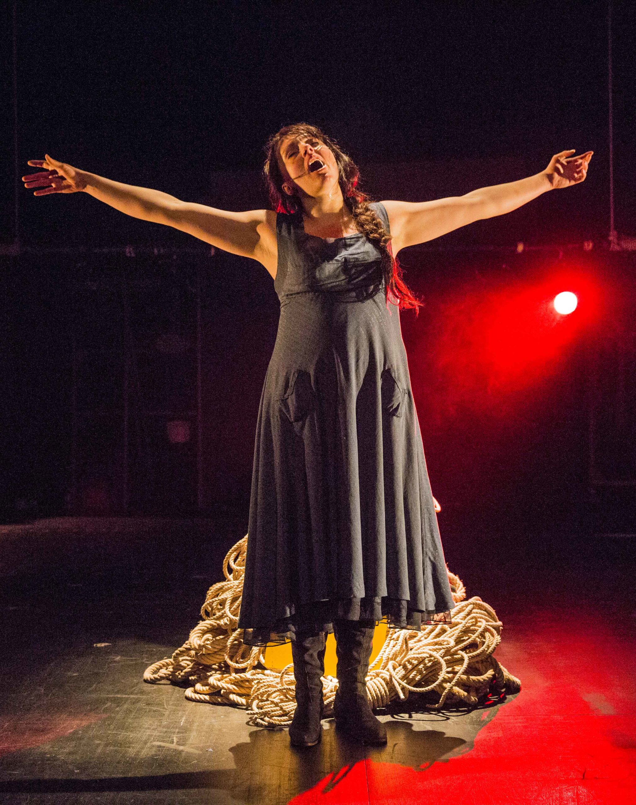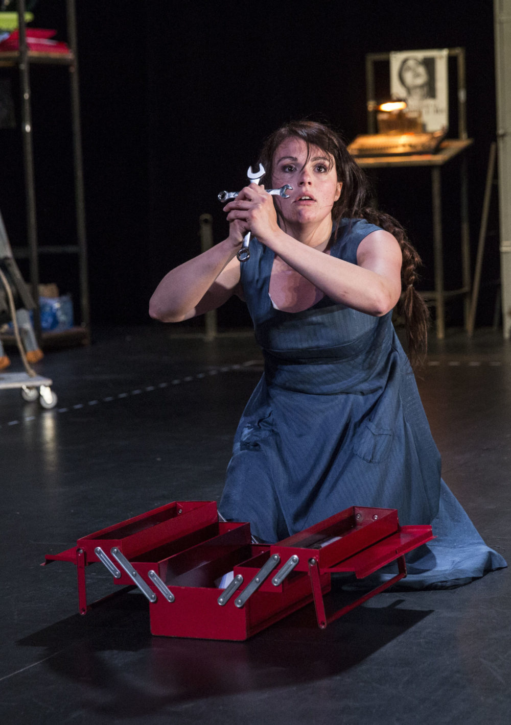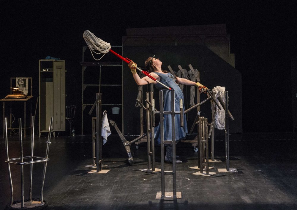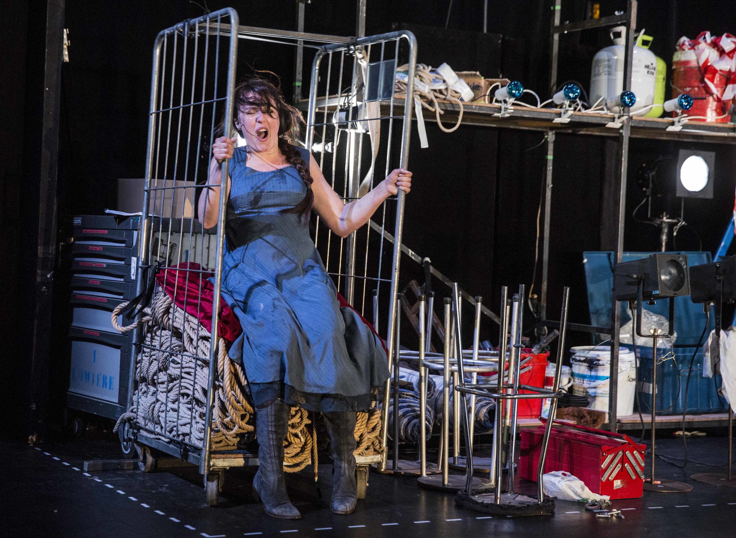 Le spectacle va se constituer sous nos yeux. Une actrice seule prend possession d’un plateau nu. La vraie nudité, pas celle de l’absence, du dépouillement, mais de l’abandon. Une femme entre dans un théâtre en repos. Seule la servante (ce tabernacle des plateaux de théâtre) est allumée. La scène ressemble à celle de tous les théâtres du monde. Sont posés là l’échelle pour les lumières, les élingues pour les cintres, le balai pour le plateau, les chariots pour transporter le matériel, bref, les outils naturels du théâtre. Confiante en la force du verbe, il suffira à l’actrice de parler pour que la chose existe. Pleine de foi en son art, l’artiste, folle de liberté, baptise à qui mieux mieux : tire une table, grimpe dessus, et voilà le beau cheval offert par Charles VII ! Alignant scrupuleusement des pieds de projecteurs, c’est toute l’armée vivante dont elle prend le commandement qui surgit ! Joie naïve. Cette générosité théâtrale parle à chacun. Elle entretient la force de l’illusion.