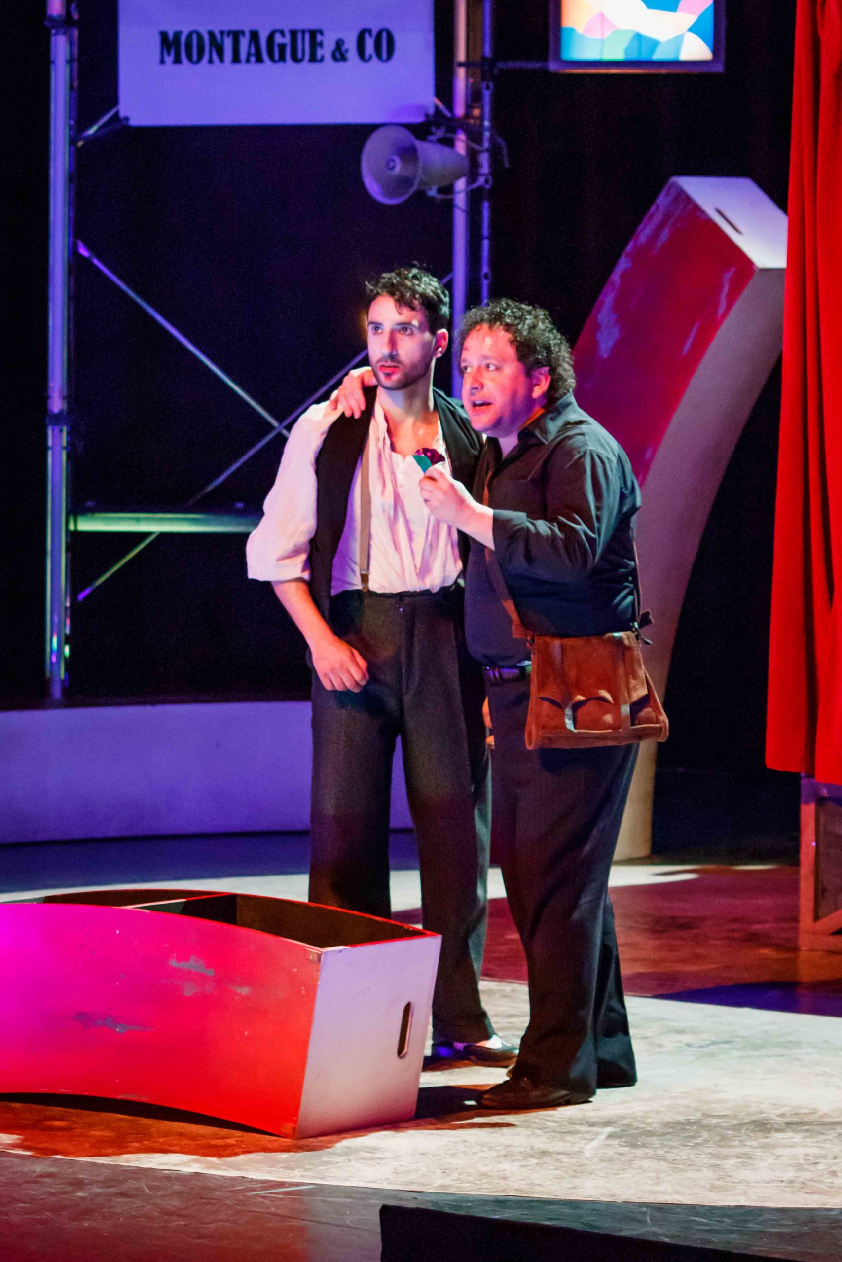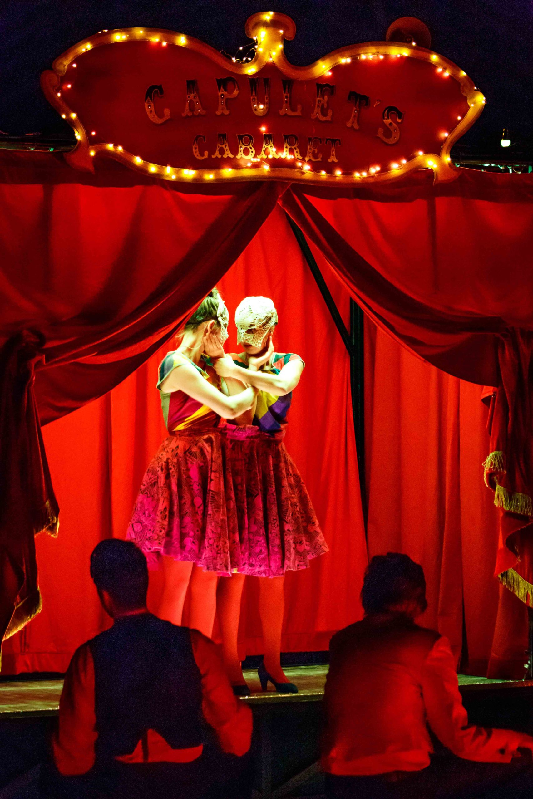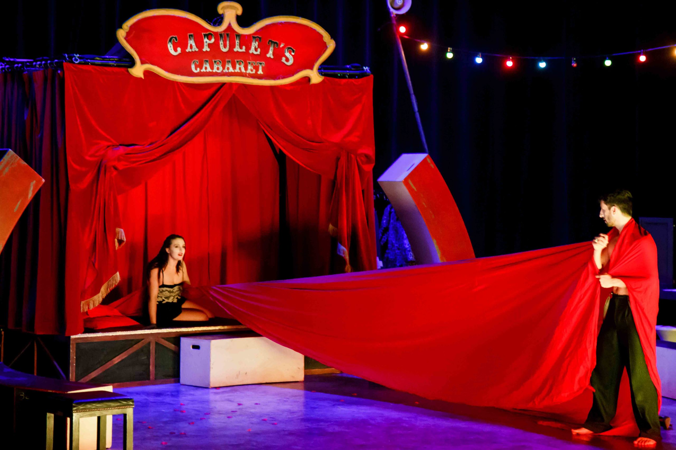 Dans les rues de Vérone, entouré d’un cercle de buildings appartenant à la richissime et célèbre famille Montaigu, le théâtre de papier de la famille Capulet, est un saisissant contraste. Vestige d’un passé révolu, ressenti comme une incongruité par les Montaigu. Un soir d’été, la troupe des Capulet présente un nouveau spectacle, mais ils sont vite interrompus par la bande des Montague, ivres, sortant d’une boîte de nuit. Un affrontement éclate, sanglant… Choc de deux univers, l’un métallique, électrique, impeccable, glacé, l’autre forain, décalé, coloré, fait de bric et de broc…C’est au travers d’un univers forain, décalé, coloré, parfois monstrueux mis en parallèle à l’univers des affaires, métallique, électrique que les rires se mélangeront aux larmes et la poésie aux armes;